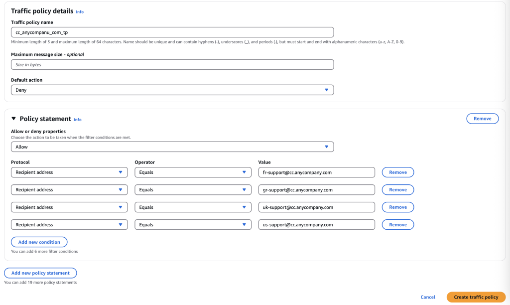 Step 1: Navigate to Amazon SES console page, Mail manager, Traffic policies, to define what traffic is allowed and denied. In the below example, default is set to deny all emails and allow only emails sent to recipient fr-support@cc.anycompany.com, gr-support@cc.anycompany.com, uk-support@cc.anycompany.com and us-support@cc.anycompany.com