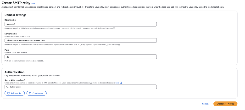 - Click on create SMTP relay and create one SMTP relay for us-east-1