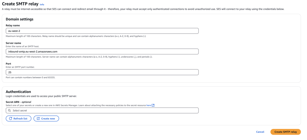 - Click on create SMTP relay again and create another SMTP relay for eu-west-2