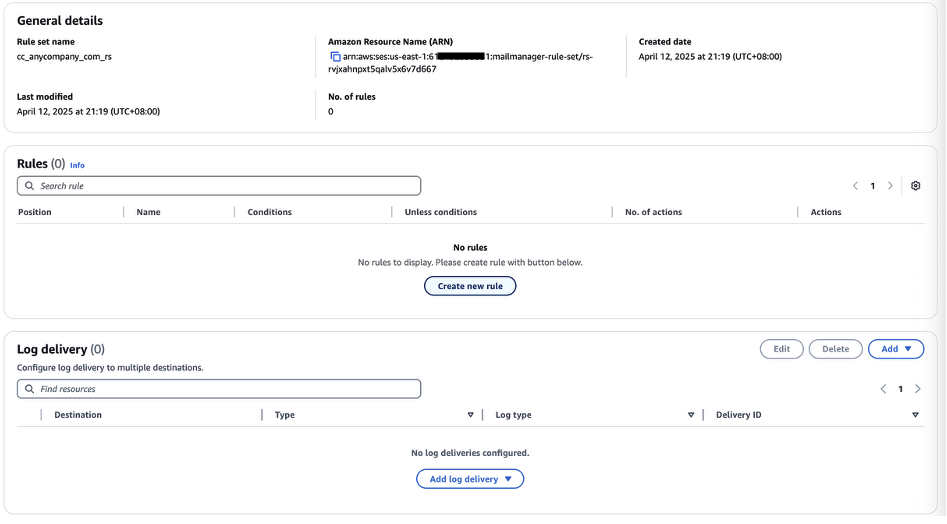 - Navigate to Amazon SES console page, Mail manager, Rule sets and click on Create rule set and give a name for the rule set