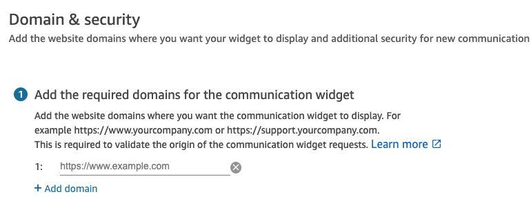 - Under Domain & Security, Add the required domains for the communication widget by copying the domain URL created via CFT template output.