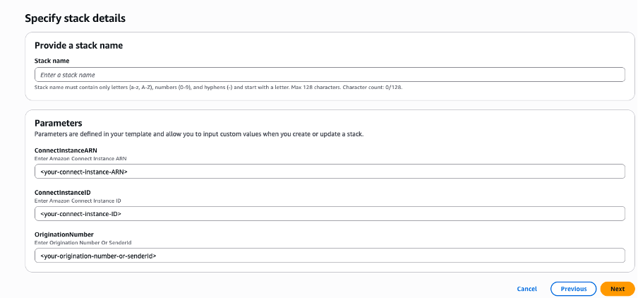 - Enter a unique name for your stack, such as ‘amazon-connect-video-calling-solution-blog’