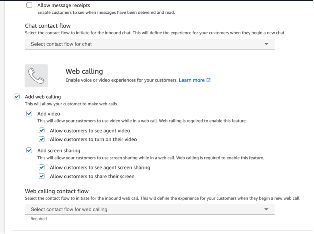 - Uncheck the chat checkbox and select web calling. Add Video and screen sharing checkboxes as well.