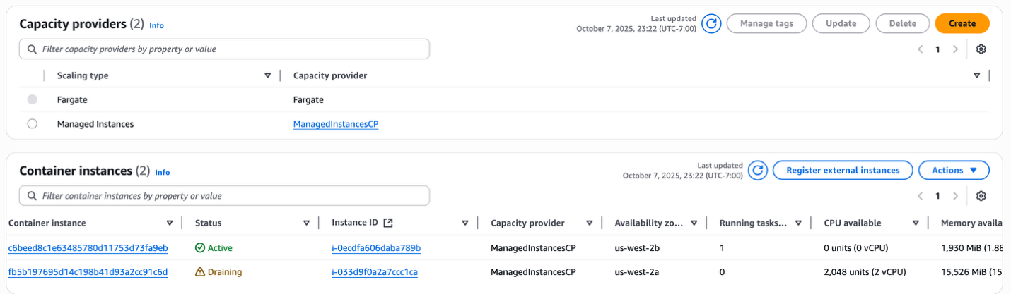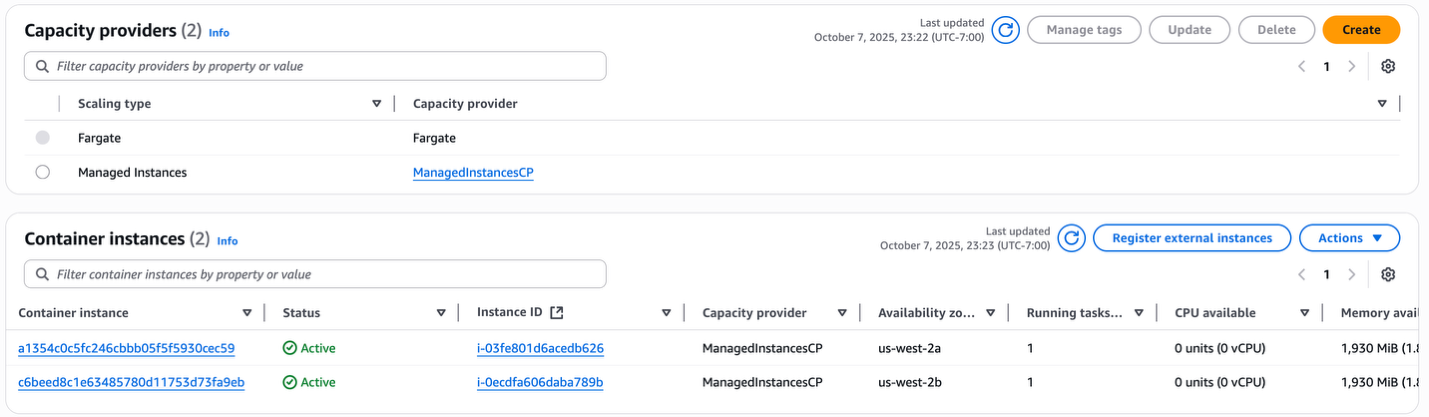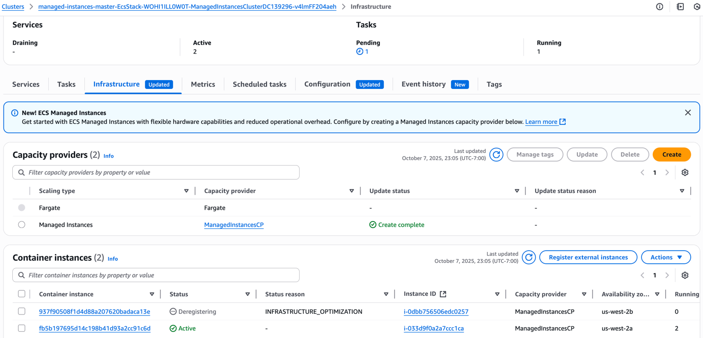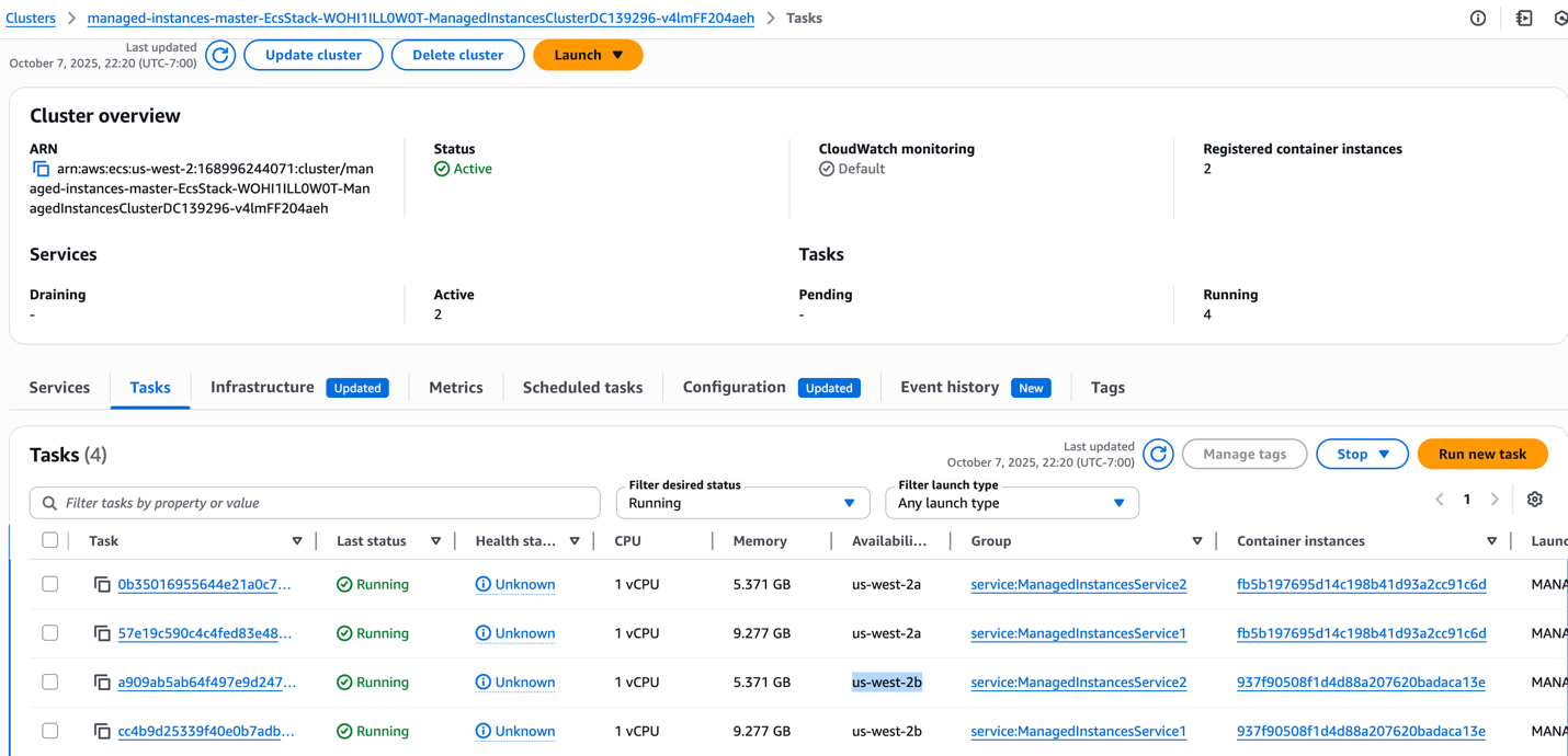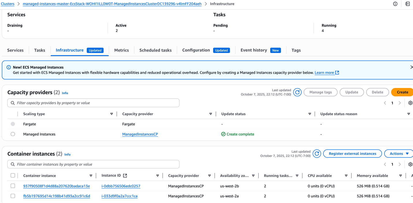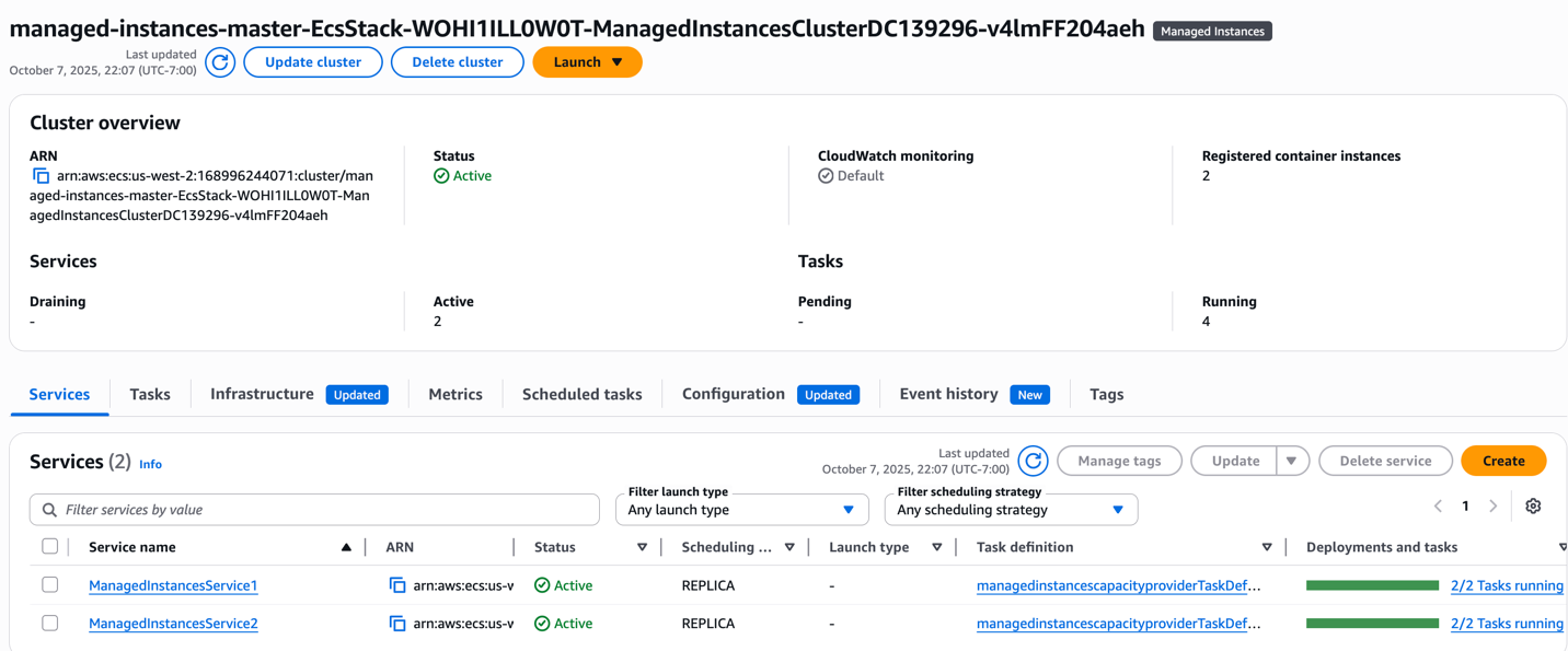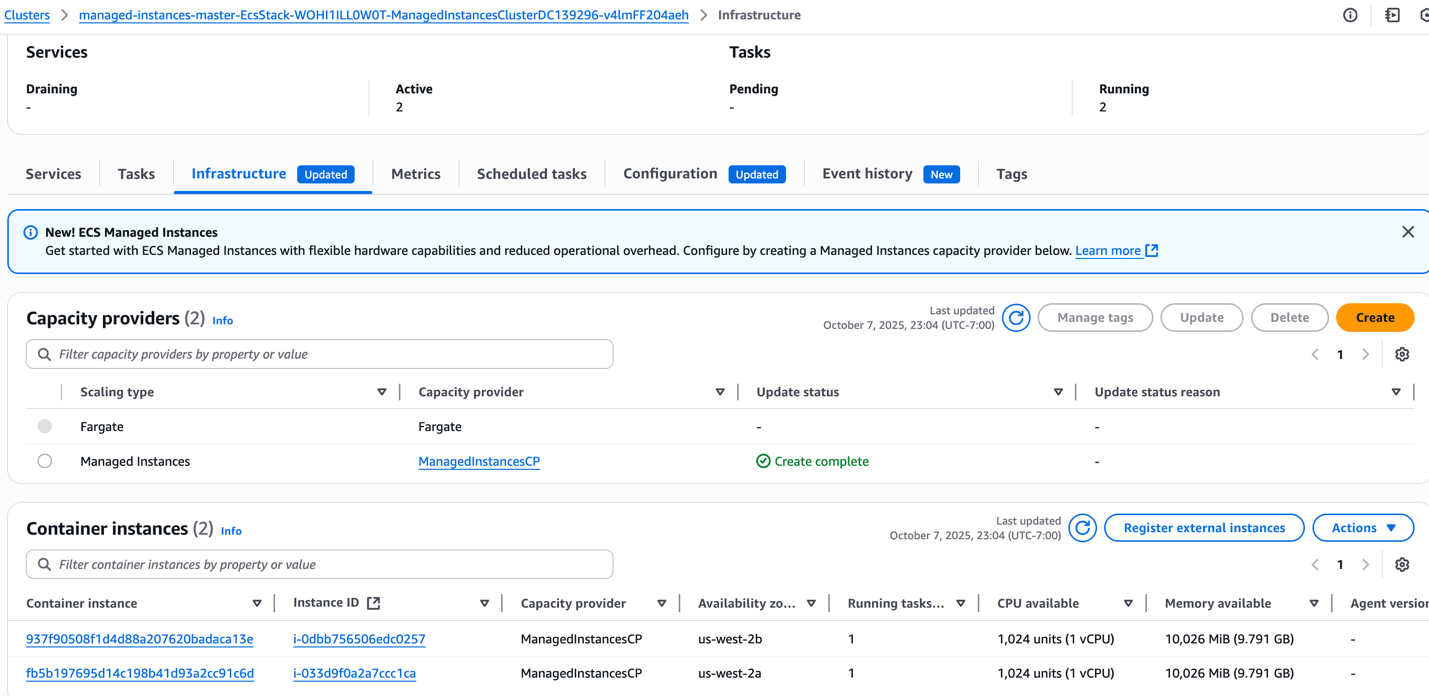 - 2 Managed EC2 instances in the Managed Instances Capacity Provider