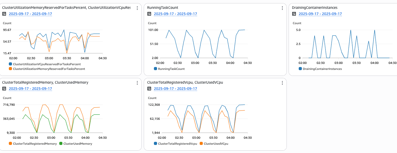 The key insight is that ECS Managed Instances maintains strong alignment between resource allocation and actual demand, with both vCPU and memory utilization metrics mirroring the cyclical task patterns exactly. The DrainingContainerInstances metric reveals the continuous background optimization at work. Rather than waiting for manual intervention, ECS Managed Instances continuously monitors resource efficiency across the cluster, and when tasks scale down, it immediately begins draining underutilized instances while gracefully moving remaining workloads to optimize cluster density. This automated process ensures no resources remain idle longer than necessary.
