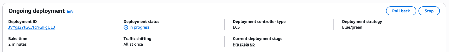 - You can monitor the ongoing deployment in the Amazon ECS console, watching the service move through the various lifecycle stages. When the deployment reaches the