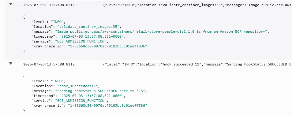 hook can be used as an admission hook, we are going to start an Amazon ECS service using a container image from an Amazon Elastic Container Registry (Amazon ECR) public repository. In our scenario, we have written a policy in our function to make sure that all container images come from either a private or public Amazon ECR repository. We can see this policy being enforced in the logs of our lifecycle hook.