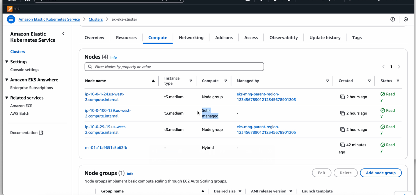 Figure 1: Amazon Elastic Kubernetes Service console with four nodes across an AWS Region, AWS Local Zone and EKS Hybrid Node.