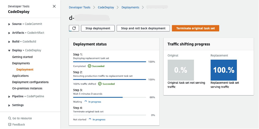 The deployment command returns a deployment ID. You can check the progress of your blue/green deployment on the AWS CodeDeploy page of the AWS Management Console.
