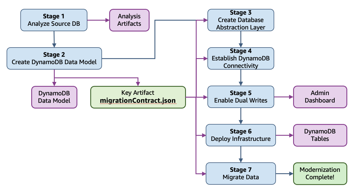The workshop guides you through seven stages that transform your MySQL database into a fully operational DynamoDB solution. Each stage builds upon the previous one, facilitating a systematic and controlled modernization process.The following diagram illustrates the seven stages of the modernization workflow, from initial analysis through final data migration.
