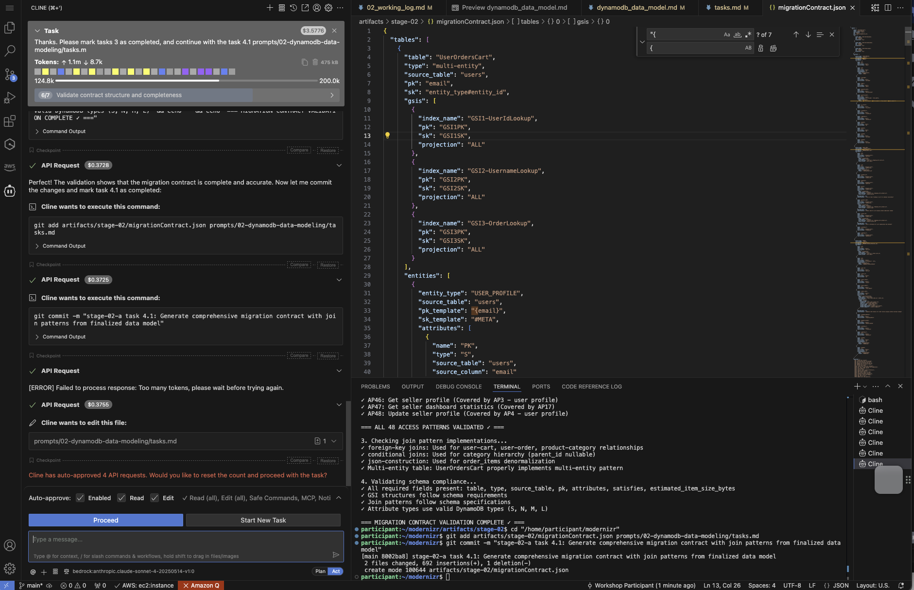 In this interactive stage, you transform your relational model into an optimized DynamoDB design. You will experience how the data model takes shape in real time. This stage involves using the DynamoDB MCP server to examine access patterns, data velocity, and business requirements, recommending table structures, partition keys, and global secondary indexes (GSIs). When the data model is ready, the workflow generates a migrationContract.json file that maps MySQL tables to DynamoDB structures, including necessary joins and transformations. This file serves as the blueprint for subsequent stages.