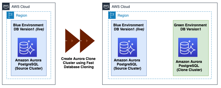 - Create an Aurora clone cluster in the green environment using fast database cloning from the source Aurora PostgreSQL cluster in the blue environment.