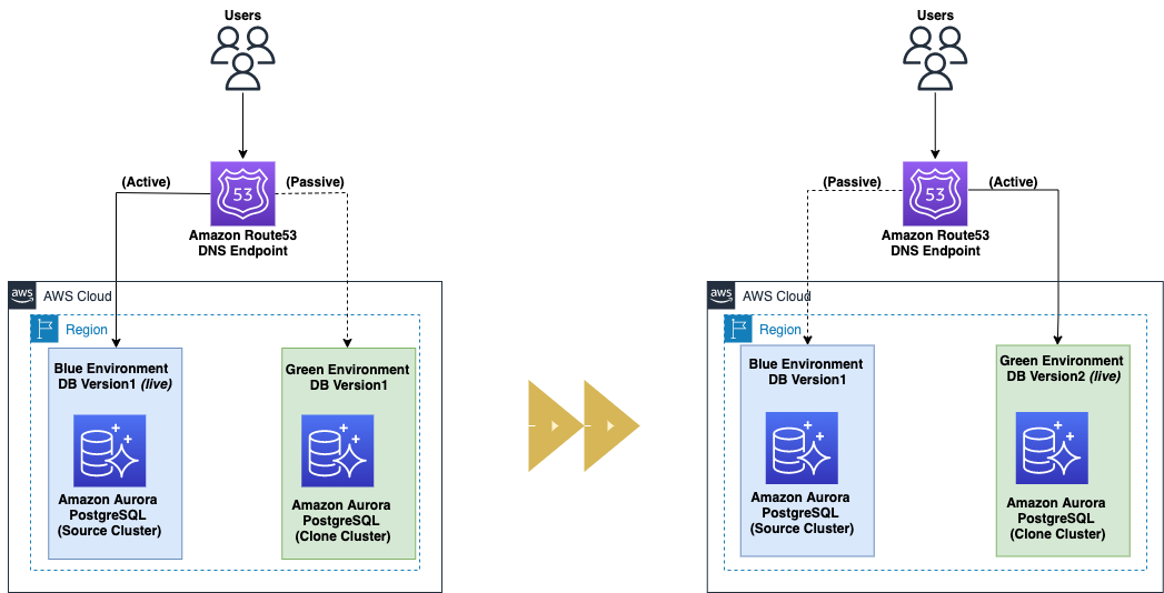 We perform schema changes and a new database version upgrade on the new cloned Aurora cluster in the green environment. After the testing is complete on the green environment, application traffic is routed from the blue to the green environment. To avoid possible data inconsistency and a split-brain situation, never write to both blue and green environment Aurora clusters at the same time.