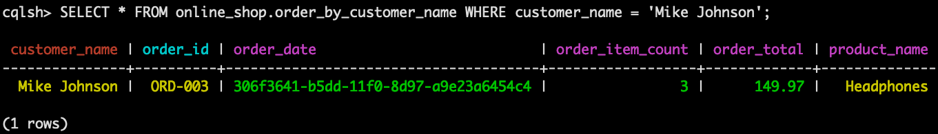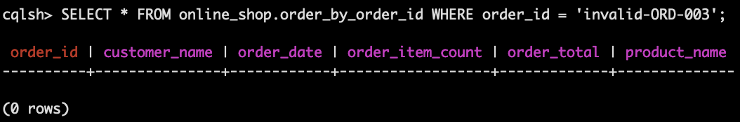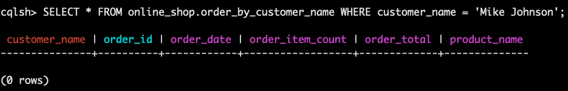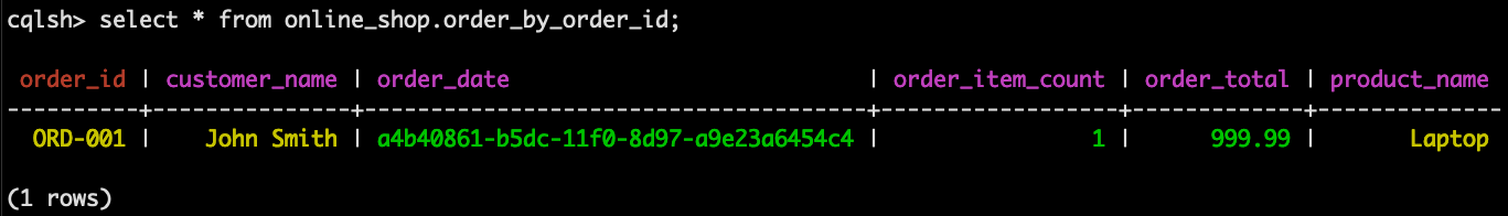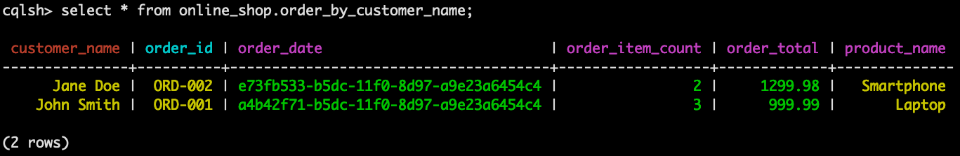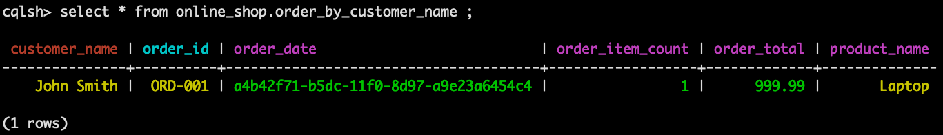 order_by_order_idandorder_by_customer_nametables; this keeps different tables and their access patterns in sync:- Validate the data is inserted correctly