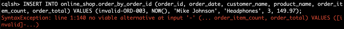 invalid-ORD-003without using logged batches. In this case, one INSERT statement fails and the other executes.
