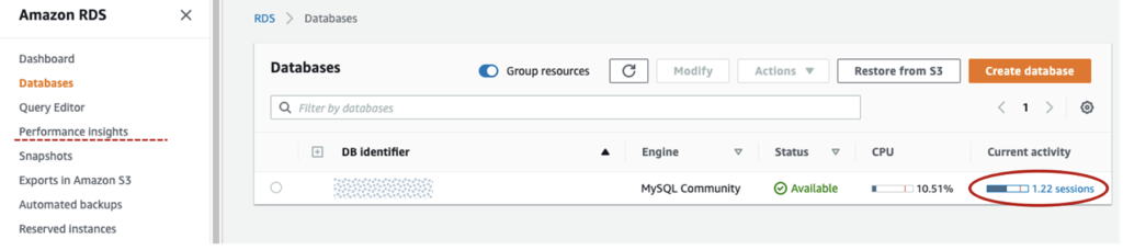 - Choose the bar under Current Activity for a DB instance to open the Performance Insights dashboard for that DB instance. Instances that have Performance Insights enabled show current activity measured in Sessions.