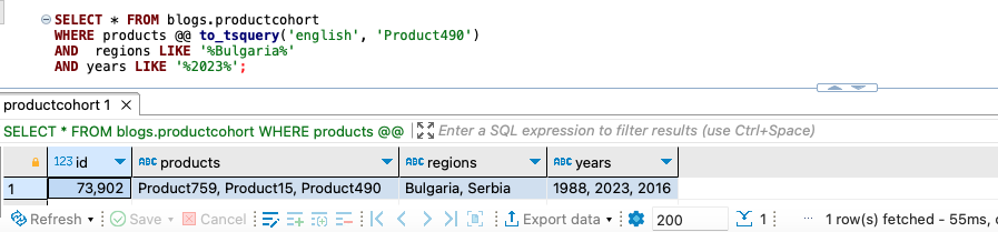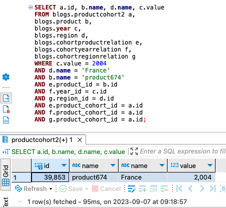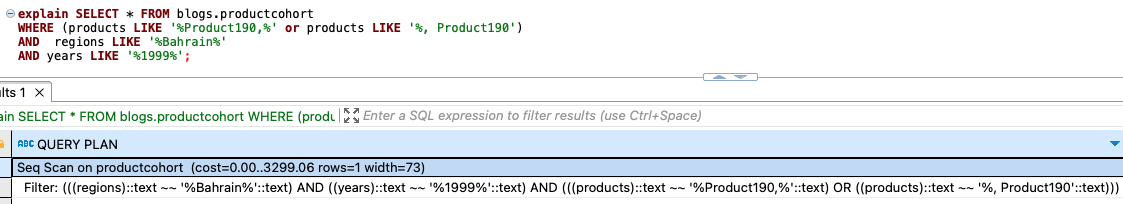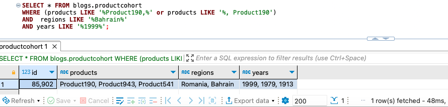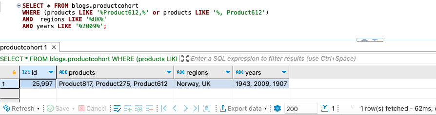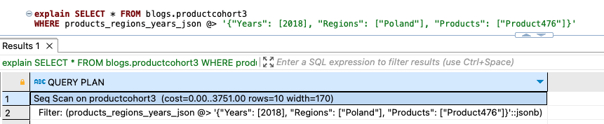 The architecture can have scaling issues for searching and filtering operations, compared to the other options reviewed in this post. The following SQL query looks up the productcohort records that contain the product Product2 sold in the US in 2020: