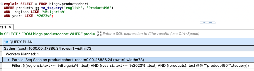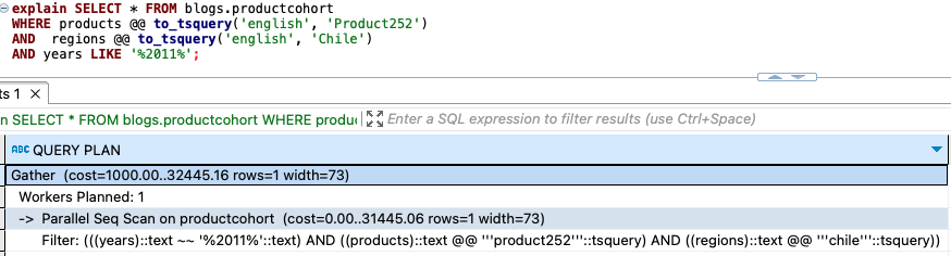 In scenarios when you need to perform a full text search of text documents, option 1 is a good fit. PostgreSQL will exclude stop words and normalize words while building GIN indexes. However, in our case, we are not saving text documents to data fields, creating GIN index does not offer a performance advantage over the similarity query. Performance varies based on the complexity of text documents, table size, and queries. You need to run your own tests, check execution plans and performances if you plan to add GIN indexes to support full text searching.