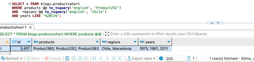 In our example, the values in the column “products”, “regions”, and “years” are delimited strings constructed by concatenating multiple basic array elements. They are much simpler than regular text documents. As shown in the testing results, creating GIN indexes by normalizing words in those data fields does not offer a performance advantage over the similarity query in our case.