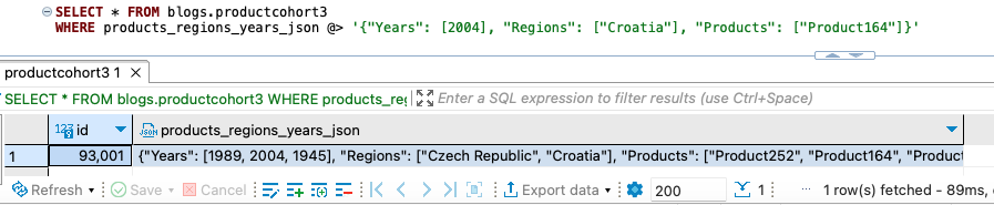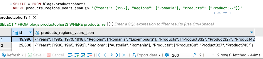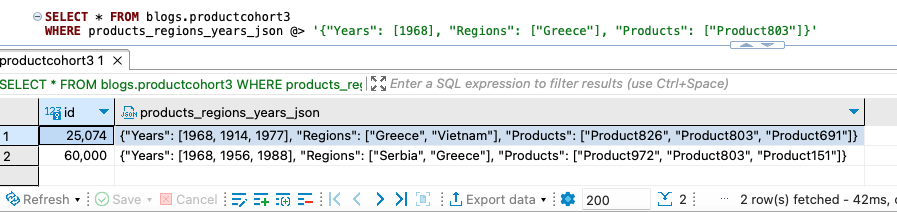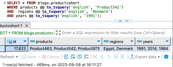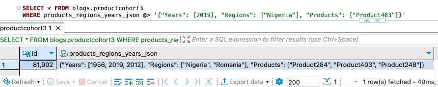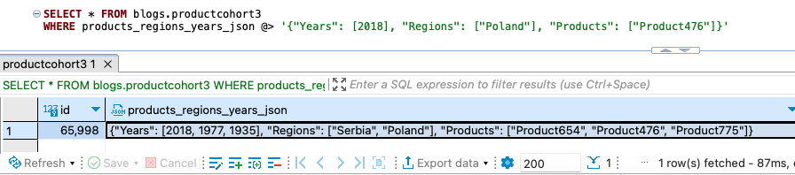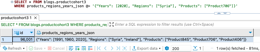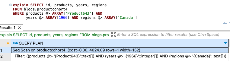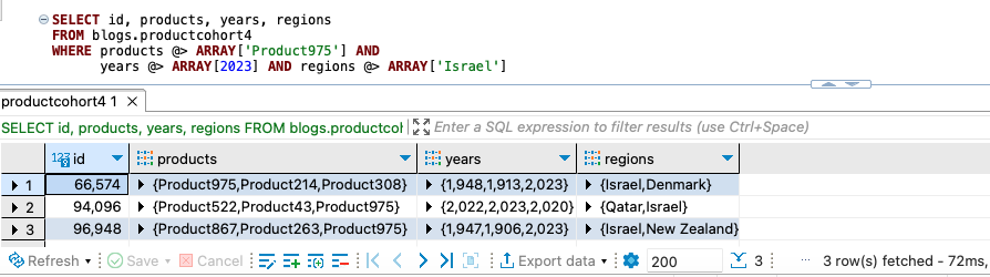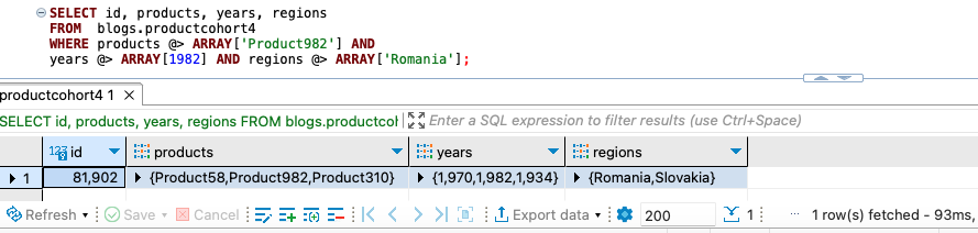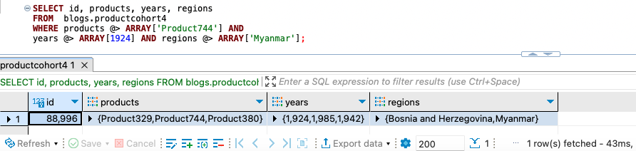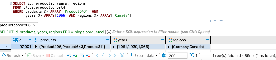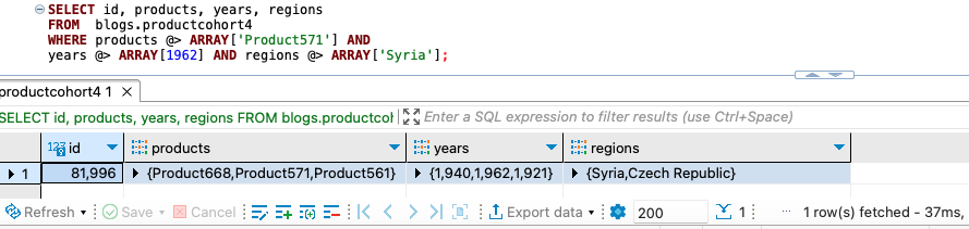 PostgreSQL provides specialized operations and functions for the array type to filter, search, and process array data fields. The following SQL query searches for the productcohort4 records that contain the product Product2 sold in the US in 2020: