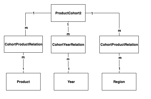 A traditional architecture is to store the array values for regions, years, and products to detail tables and store the business object ProductCohort in a primary table. Relationships between the primary table and the detail tables are stored in a set of relation tables. The following diagram shows the design of seven tables to represent the ProductCohort business object.