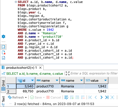 For performance testing, we insert 100,000 rows into the table blogs.productcohort3 and run the following queries.