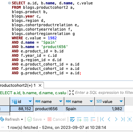 For performance testing, we insert 100,000 rows into the table blogs.productcohort. We run the following select statements.