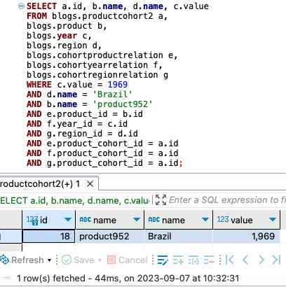 For performance testing, we insert 100,000 rows into the table blogs.productcohort4. we run the following queries.