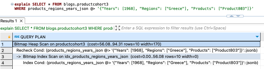 To scale and speed up searching and filtering operations, we create a GIN index to the column products_regions_years_json: