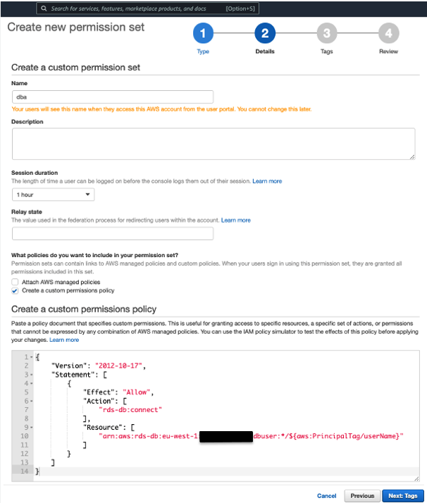 The policy defines that the related users can log in onto the <DATABASECLUSTER> database, using a database user whose name corresponds to the AWS SSO userName field.