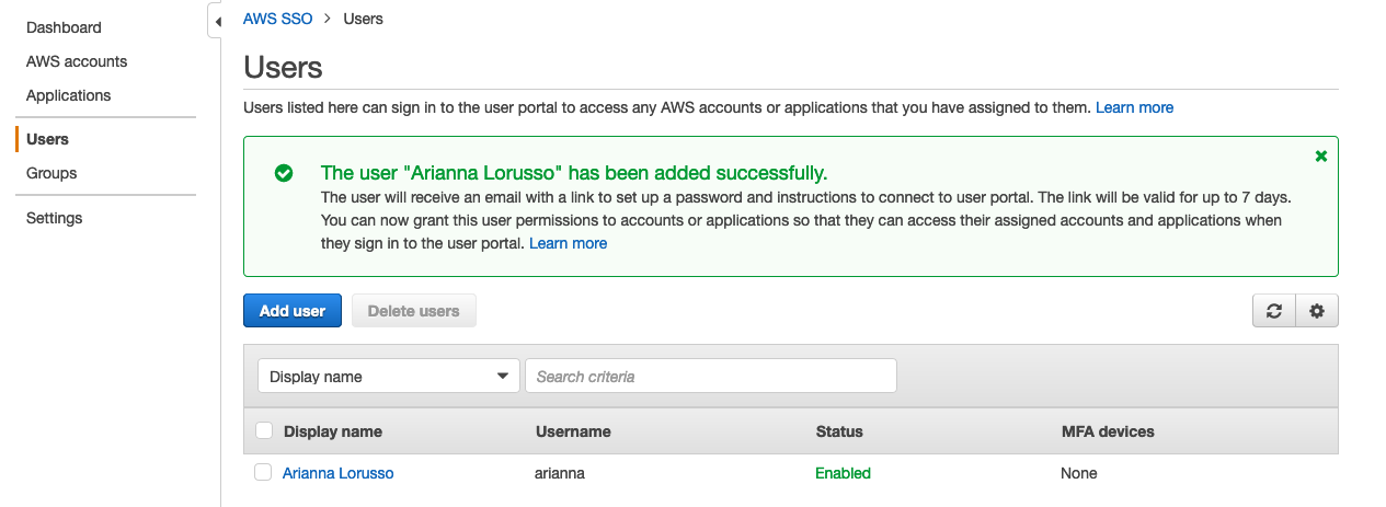The following screenshot shows the new user listed on the AWS SSO console.