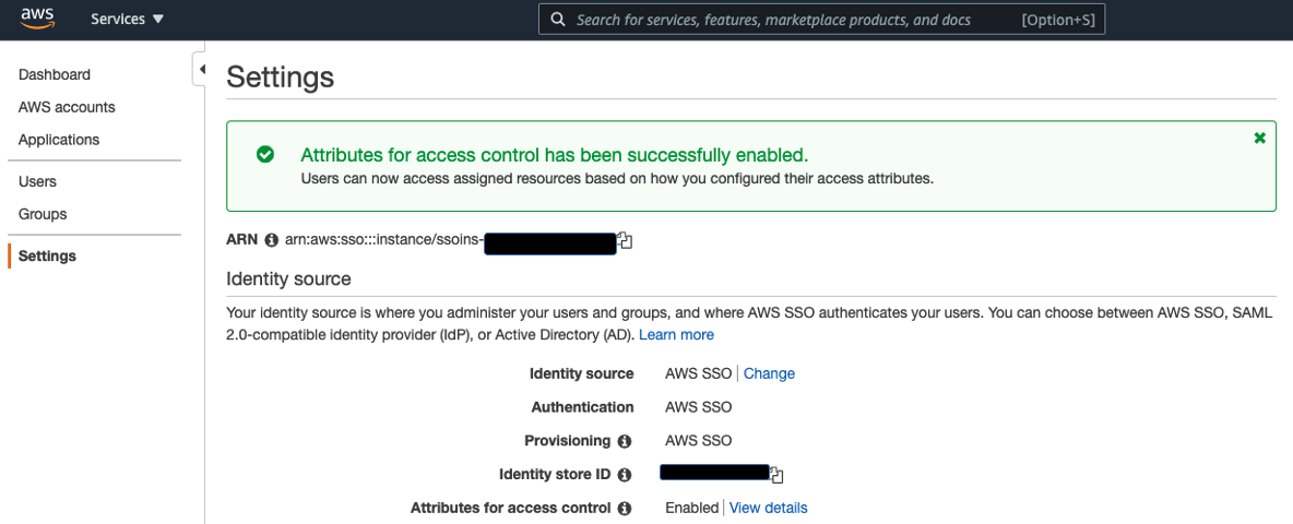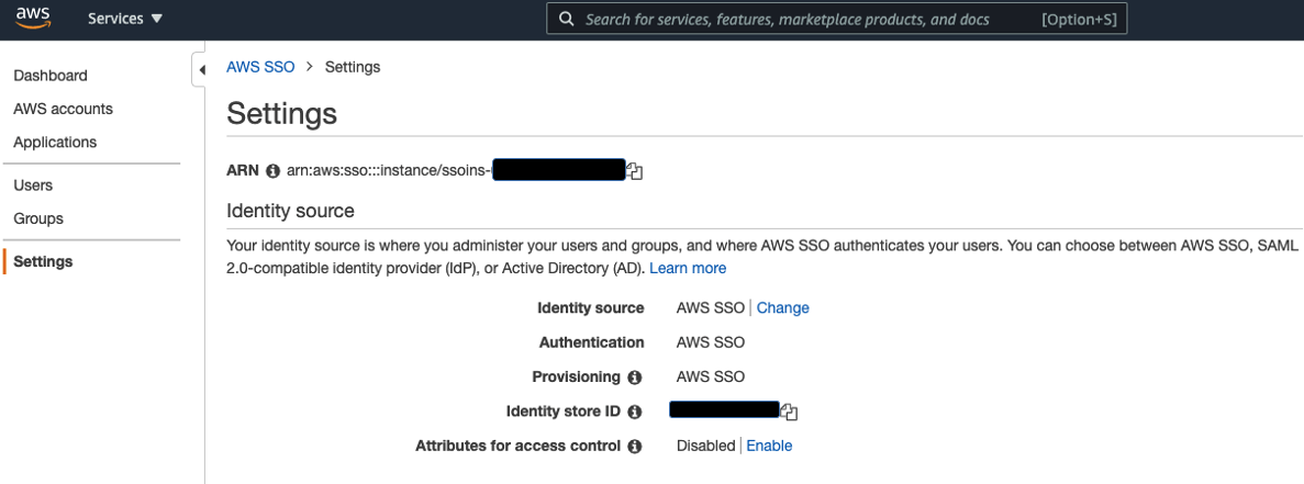 - On the AWS SSO console, choose Settings in the navigation pane.