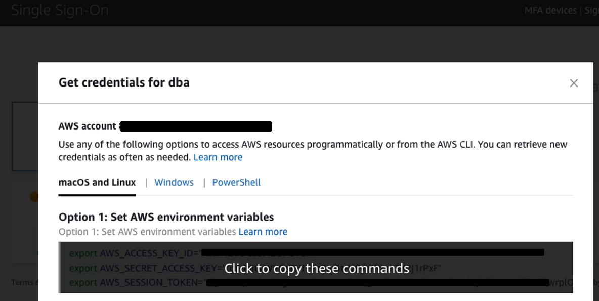 You can copy the credentials into a shell, and you’re now ready to make AWS services API calls, according to the permissions configured in your associated permission set.