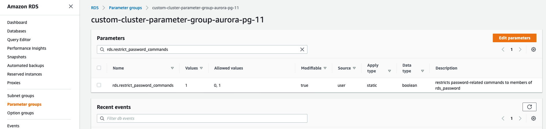 To use restricted password management, your database cluster must be running Aurora PostgreSQL 10.6 or higher. Because the rds.restrict_password_commands parameter is static, changing this parameter requires a database restart.