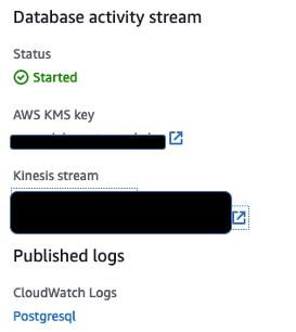 When it’s enabled, you can see under the configuration page the details of the database activity stream, along with the status Started.