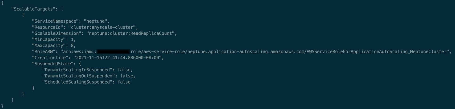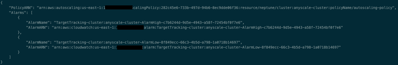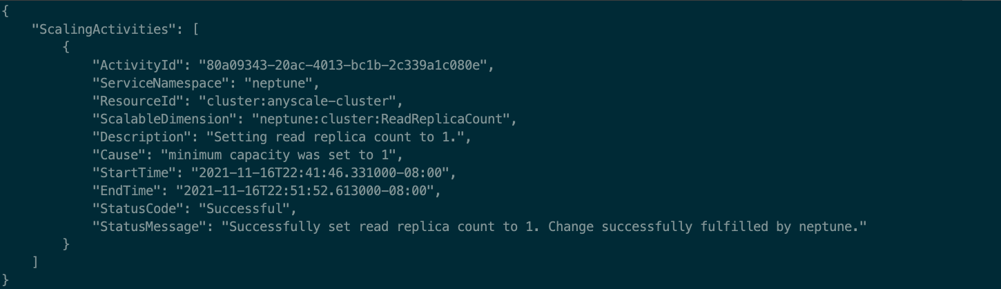 To configure auto scaling, your Neptune cluster should have at least one reader instance and one writer instance already deployed. After they’re deployed, you need to register the cluster with Neptune auto scaling using the following AWS Command Line Interface (AWS CLI) command: