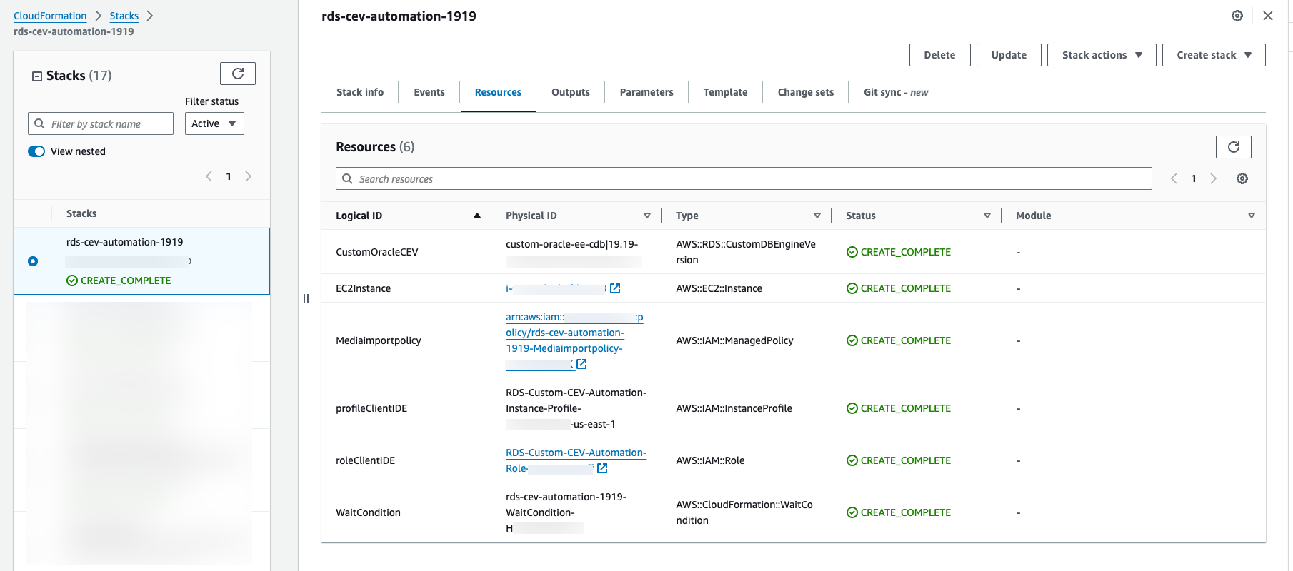 We propose a solution to create a CEV by using a CloudFormation template, which helps avoid the aforementioned issues. We provide a CloudFormation template—you just need to download the template and follow the deployment steps to build the CEV. As of this writing, the template is developed to create the latest 19c version CEV.