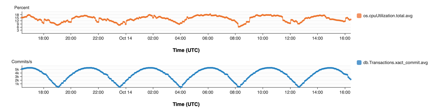 The load simulated by a cyclic positive sine wave that triggers thread that insert new orders. The orders are stored it in Amazon Simple Queue Service (SQS) queue for processing by another type of threads that updates the orders. The load consumes 20% of the database CPU and process up to 5000 transactions per second (denoted by xact_commit in the diagram)