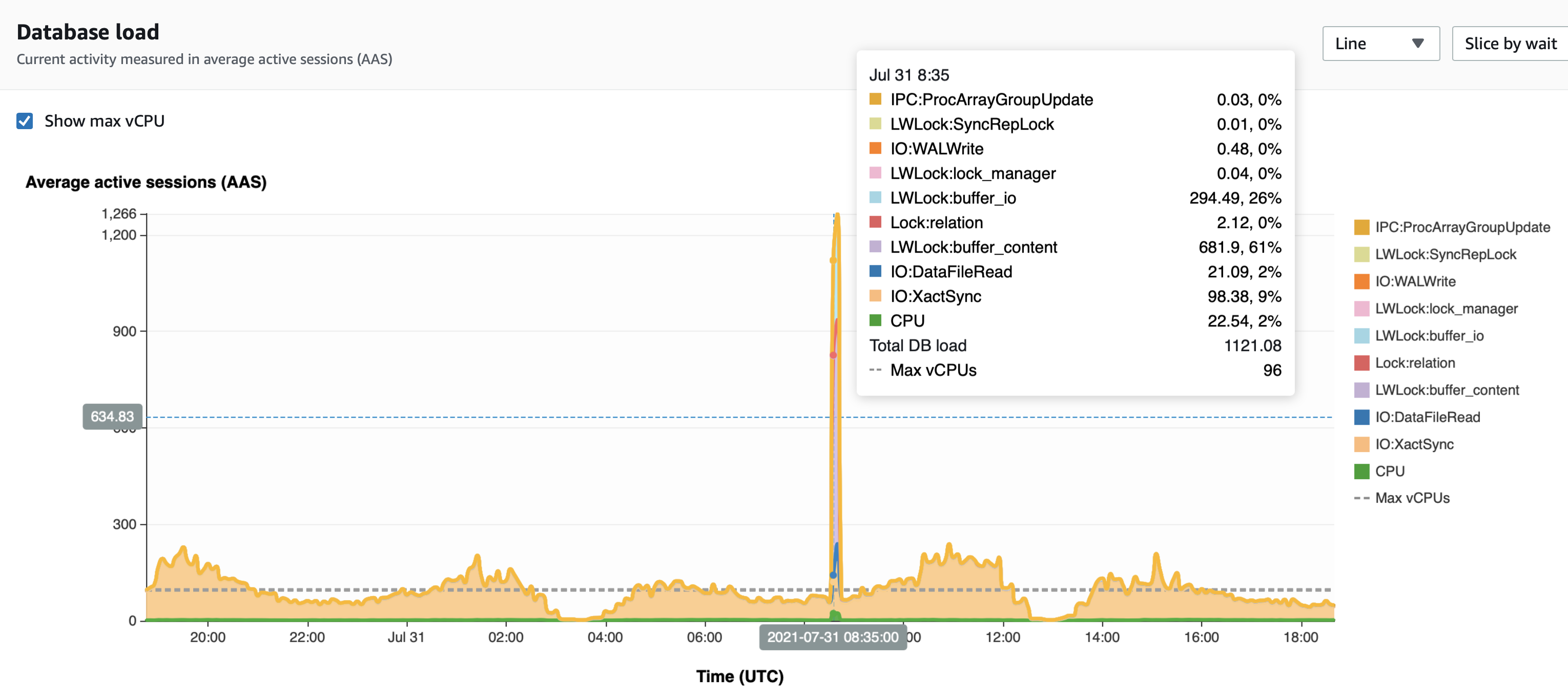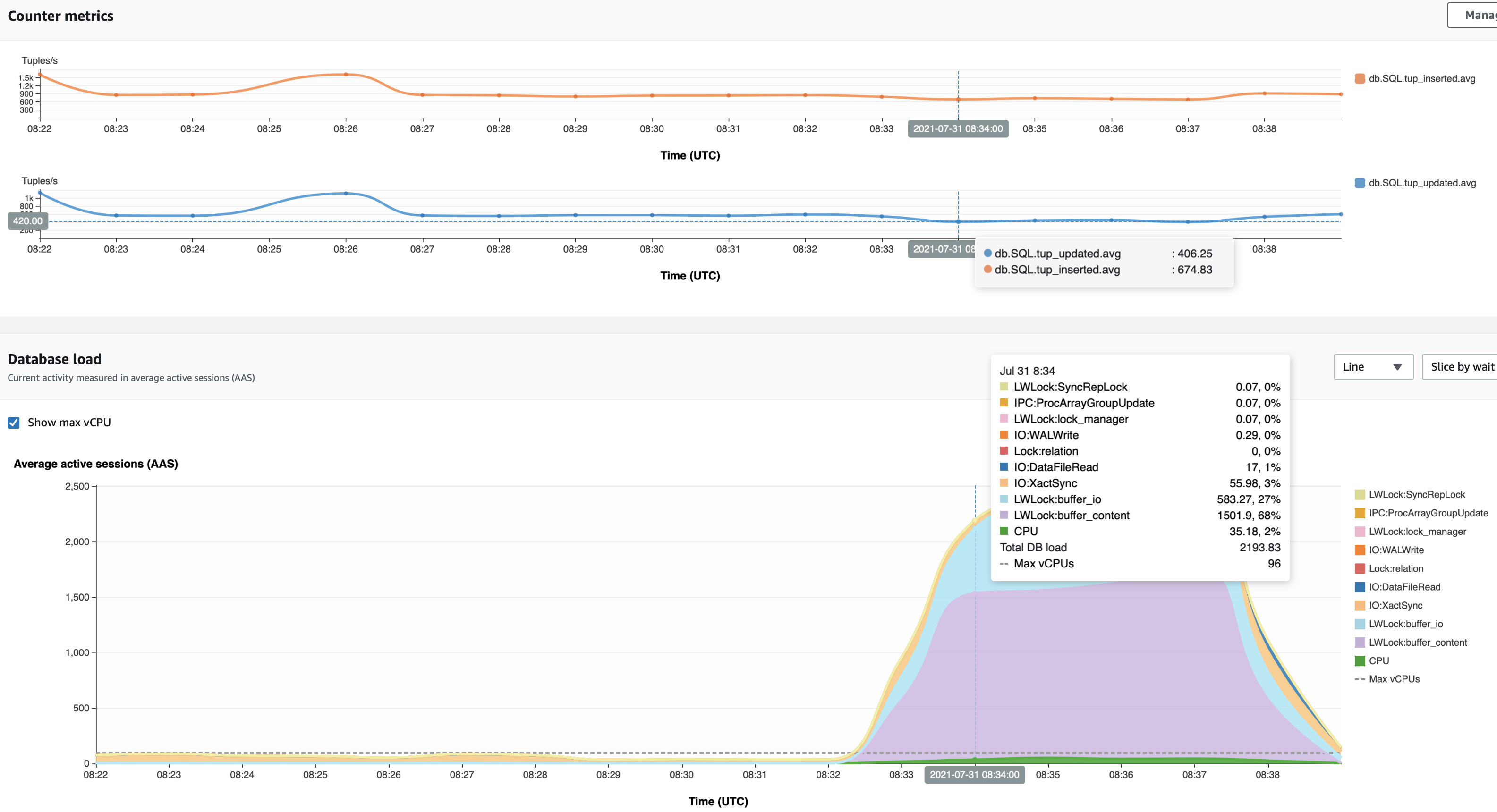 We ran a benchmark with a load simulator that generated 1,000s transactions per second and 20 TB of data to demonstrate an application workload and data that causes the contention. We observed accumulations of buffer_content LWLocks during a peak load, where many sessions acquired an exclusive lock instead of a shared lock on a page during insert and update. This caused the database to reduce insert and update throughput and even caused the database to be unresponsive, resulting in application service interruption.