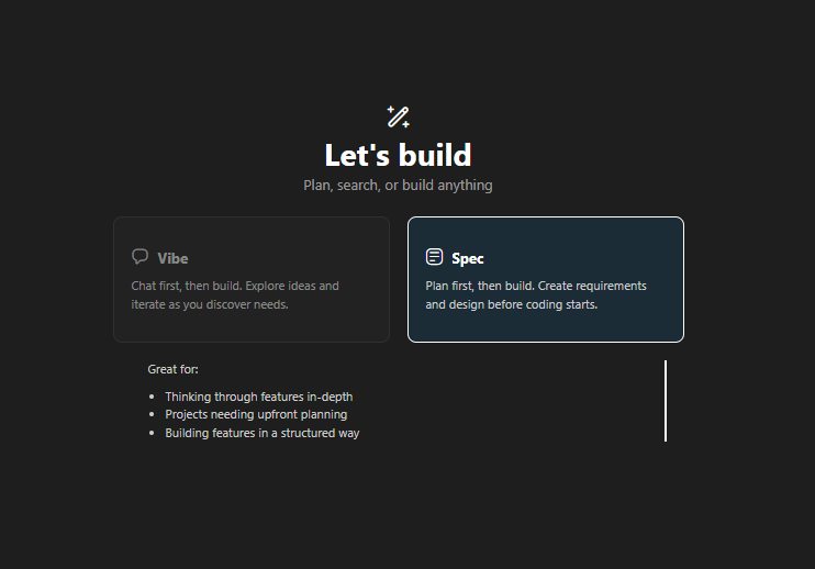 Kiro uses a structured approach, rather than immediately beginning with code implementation: