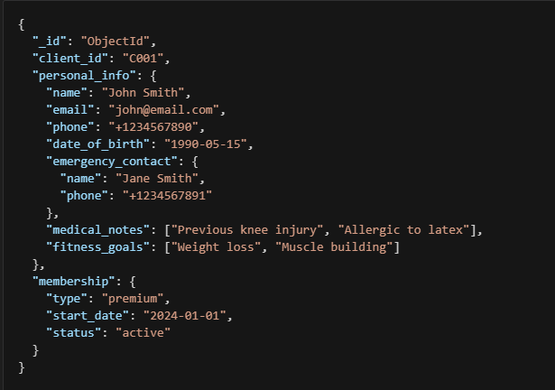 The design uses the document-based structure of Amazon DocumentDB to handle complex fitness data relationships. The following are a few samples from design documents.