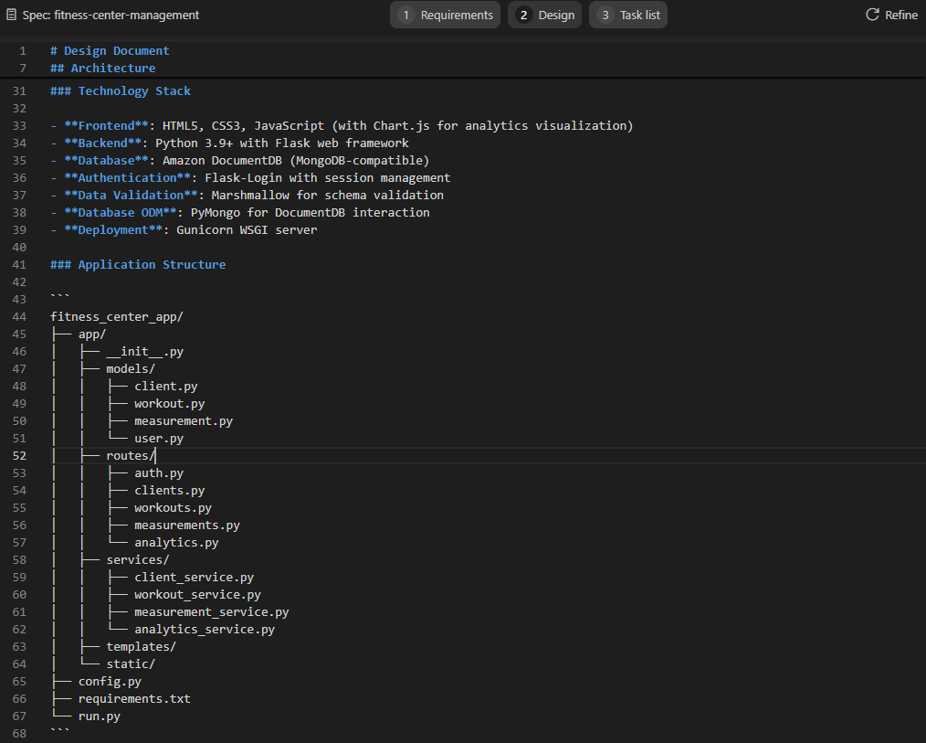 We designated Python as our development language and Amazon DocumentDB as our backend database in the prompt. For other components and frameworks, we delegated those decisions to Kiro.
