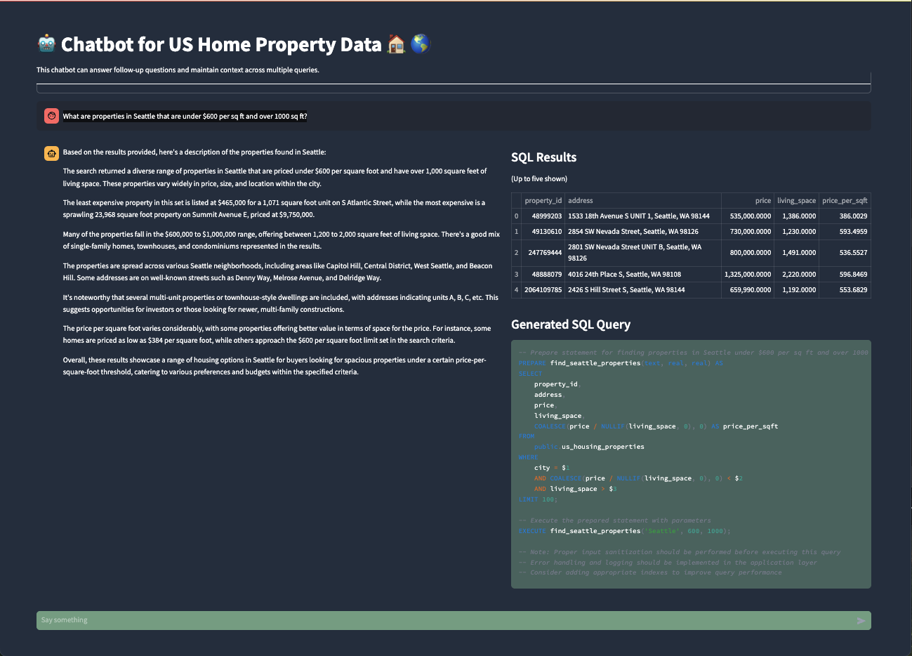 While this demonstration uses a single housing data table, the underlying text-to-SQL application is capable of supporting complex JOINs across multiple tables in more advanced implementations.