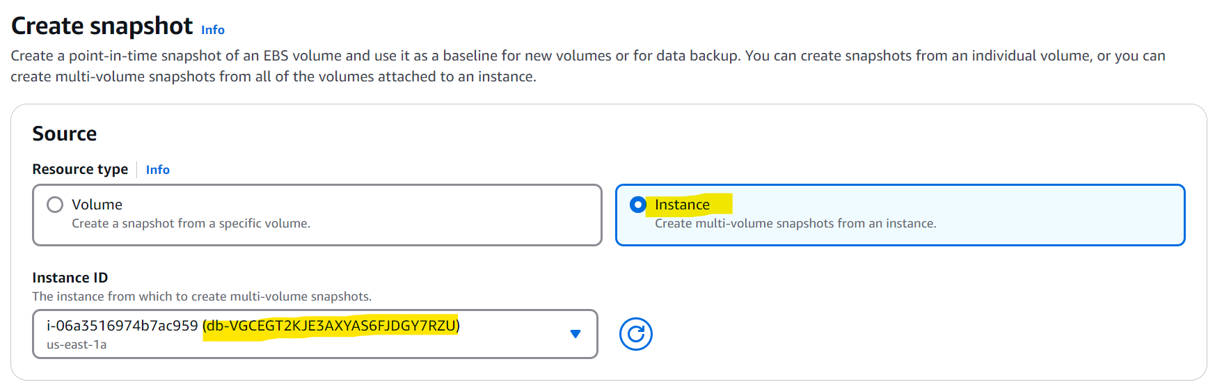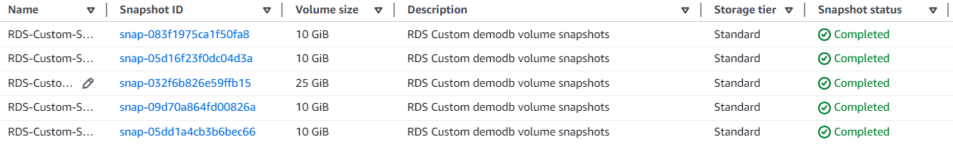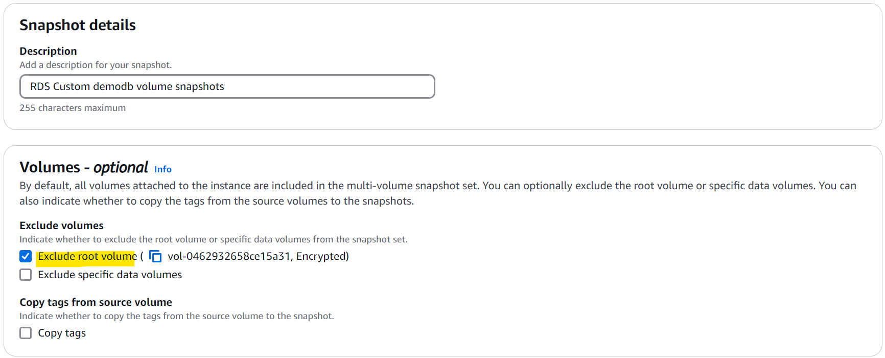 It’s recommended to perform multi-volume snapshot creation when the RDS Custom for Oracle instance is in the AVAILABLE state and no backups are running for that specific instance.Multi-volume snapshot Create a multi-volume snapshot from the underlying EC2 instance.