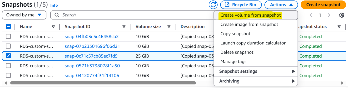 - Select the snapshot, go to Actions and then select Copy snapshot.
