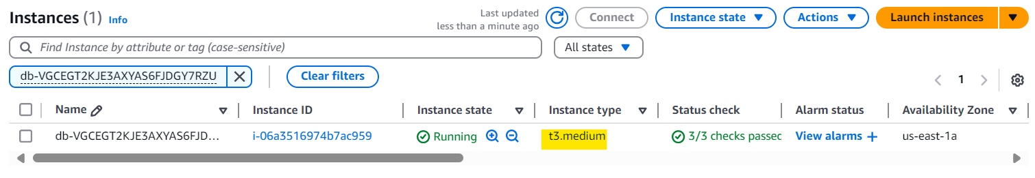 - On the Amazon EC2 console, search for the Instance ID that matches the Resource ID from the RDS console, as shown in the following screenshot
