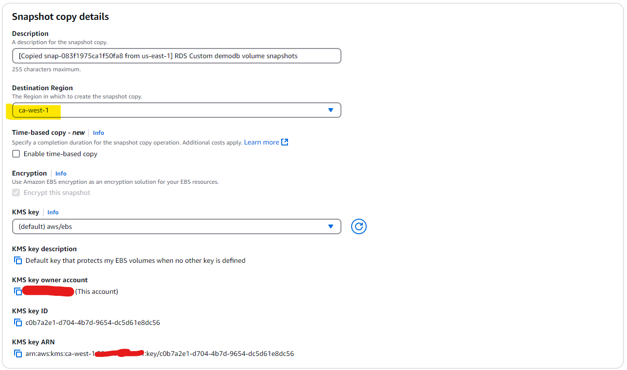 - Specify the Destination Region. In this example, we are copying to ca-west-1, as shown in the following screenshot.