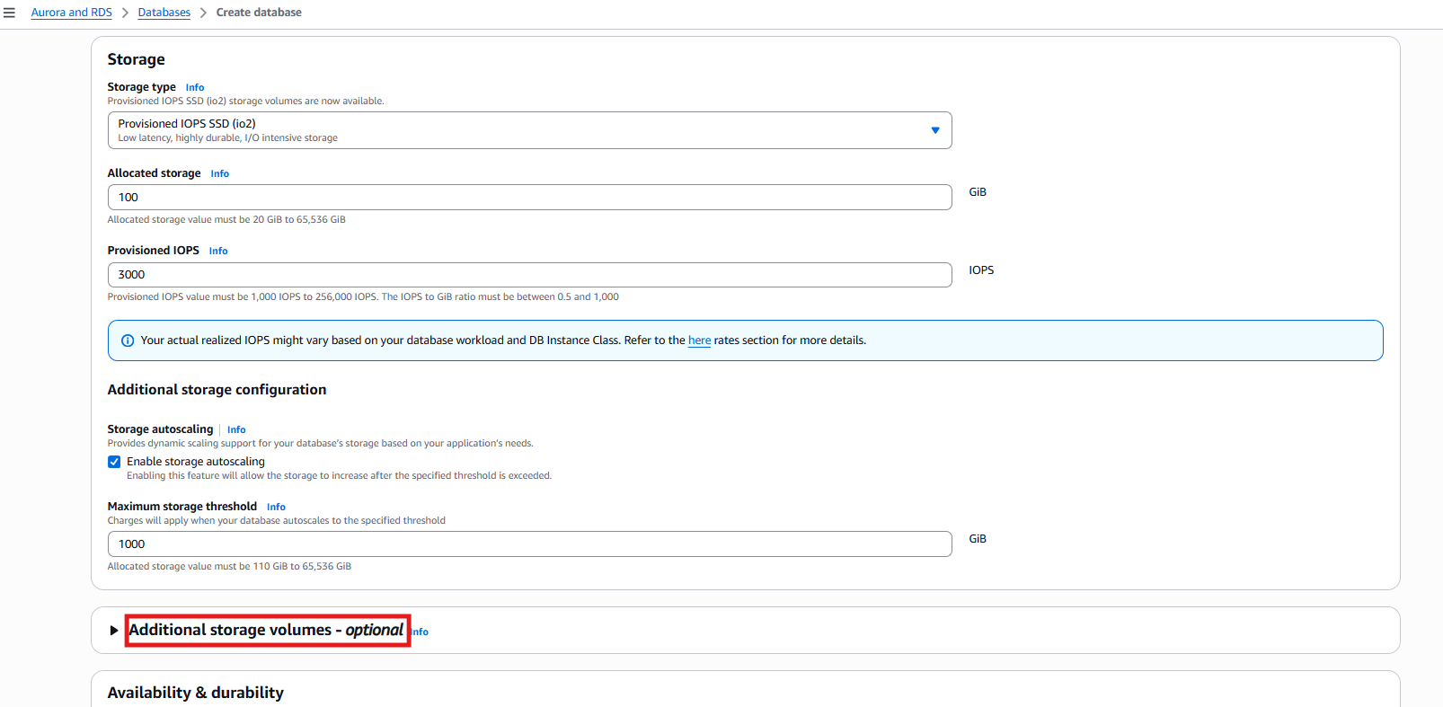 - Select appropriate values for Volume name, Storage type, Allocated storage, Provisioned IOPS, and Storage throughput.