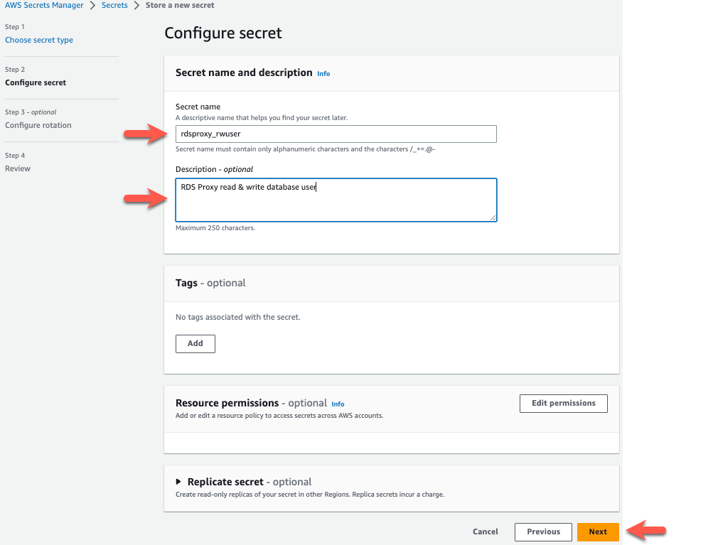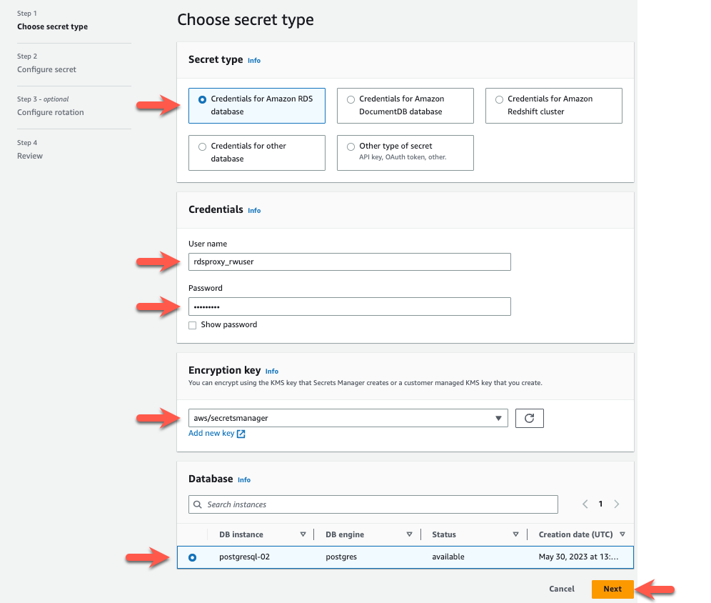 RDS Proxy uses secrets to validate and connect to the database. Complete the following steps to create a new secret: