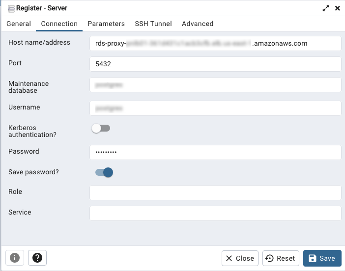 From an authorized desktop (allowed IP range on network ACL), launch pgAdmin (or your tool of choice) and open a new query. Connect to the RDS instance using the Network Load Balancer endpoint as the host name, and the database user and password configured for RDS Proxy.